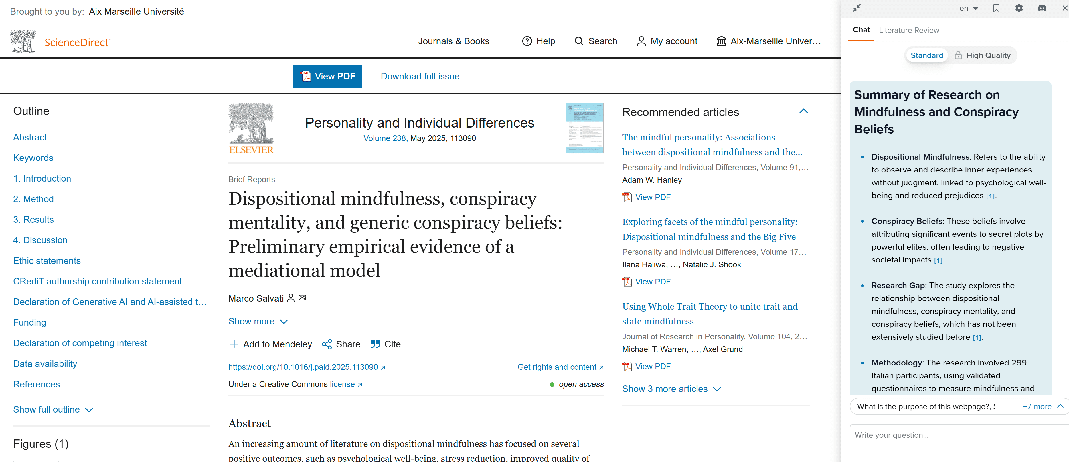 SciSpace propose une version gratuite et dispose d’un plugin Chrome qui permet, si vous avez Lean Library installé et donc accès aux articles scientifiques en affichage web, de les résumer directement lorsque vous êtes sur la page pour évaluer leur intérêt.